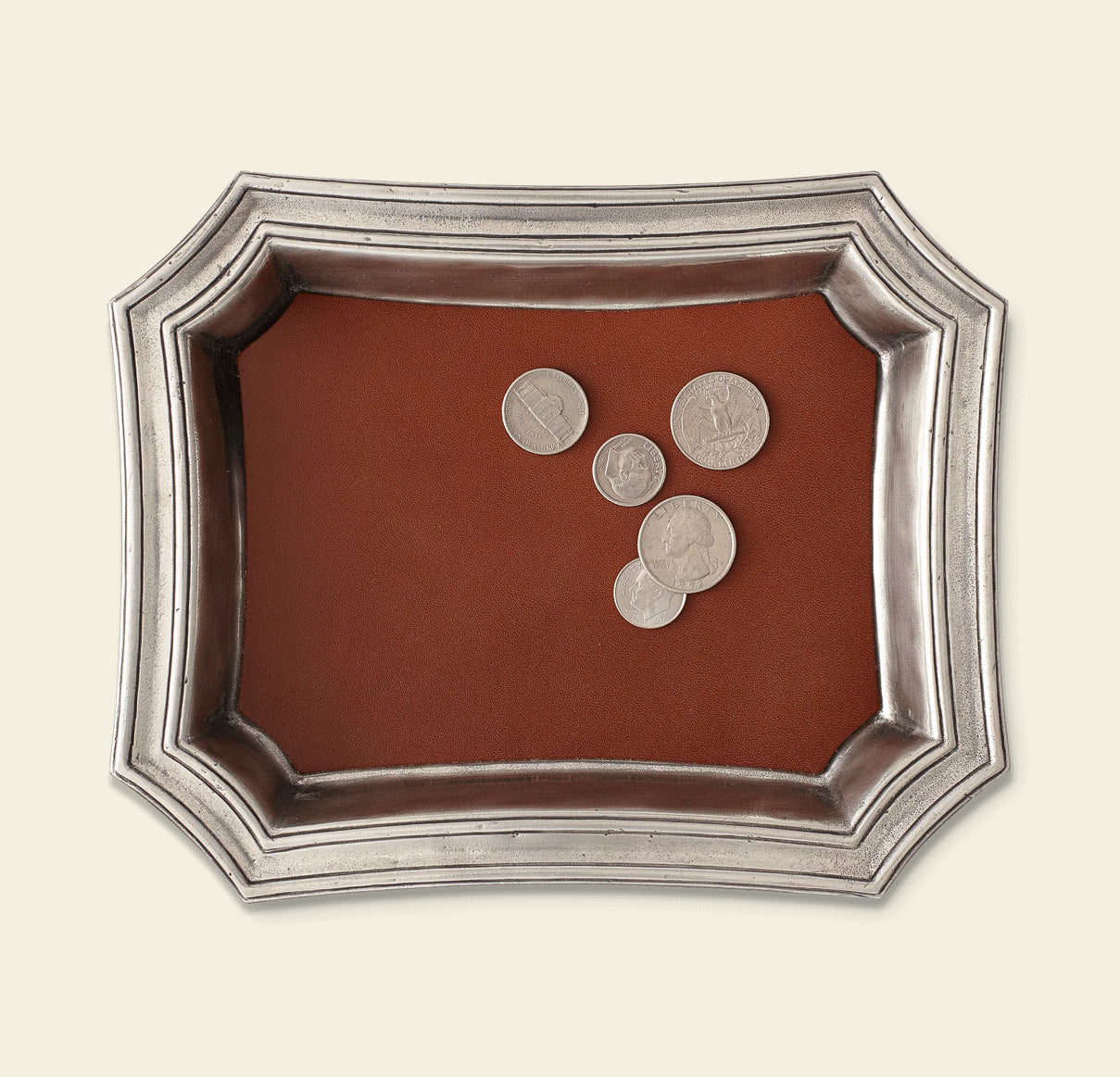 This handsome pewter pocket change tray with a brown leather lining is an ultra-versatile piece with an array of uses: some place it on an entry console as a handsome catch-all for keys and spare change, or on the coffee table for the remote controls, others find it perfect for the desktop, nightstand or dresser.