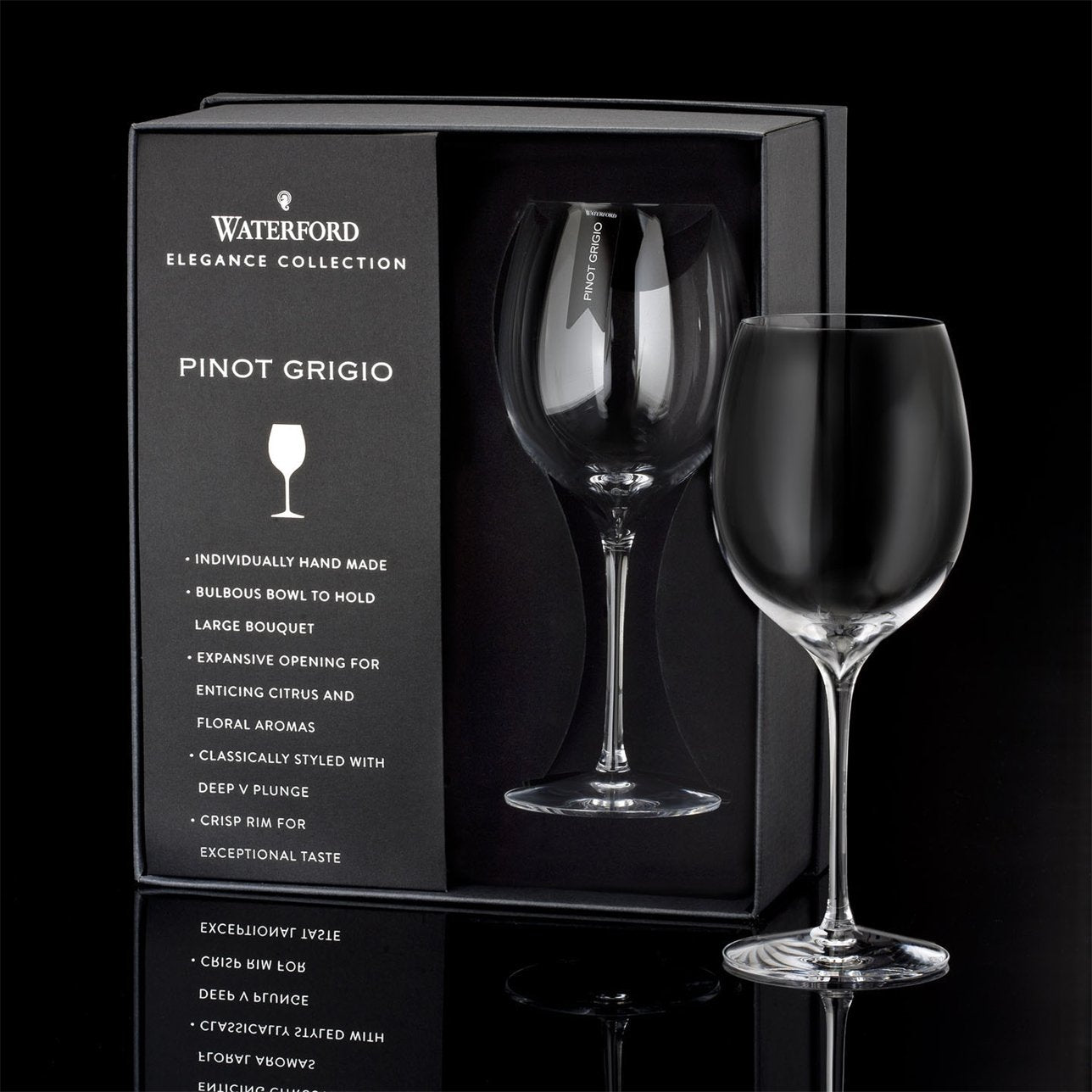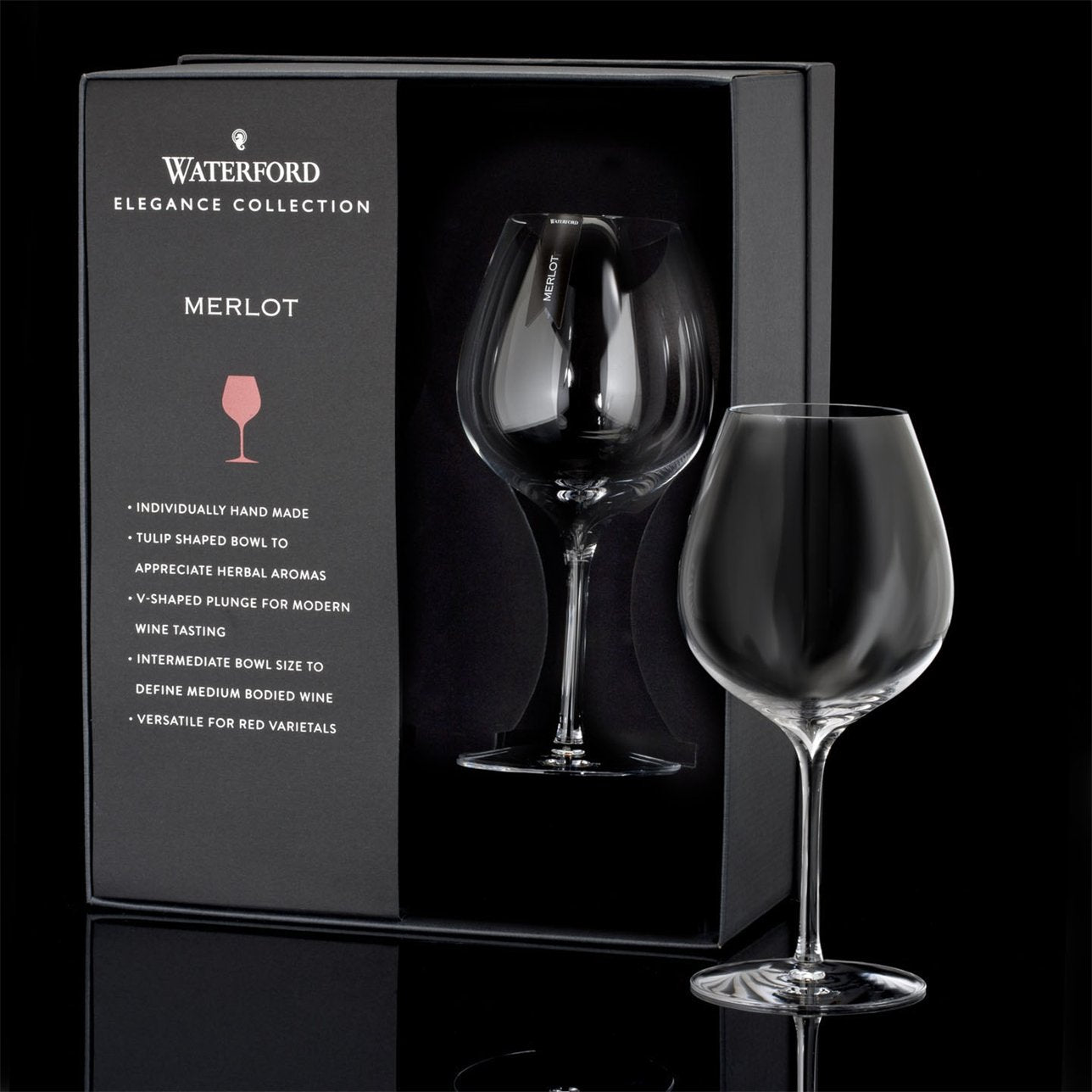 The Waterford Elegance Collection is a crowning achievement of craftsmanship and the pinnacle of elite fine wine and spirits enjoyment. The Waterford Elegance Collection features hand-made crystal to suit every wine varietal. Each crystal Elegance stem is uniquely contemporary in design, with a clear, delicate bowl, deep V plunge, crisp rim, pulled stem and flawlessly modern profile.