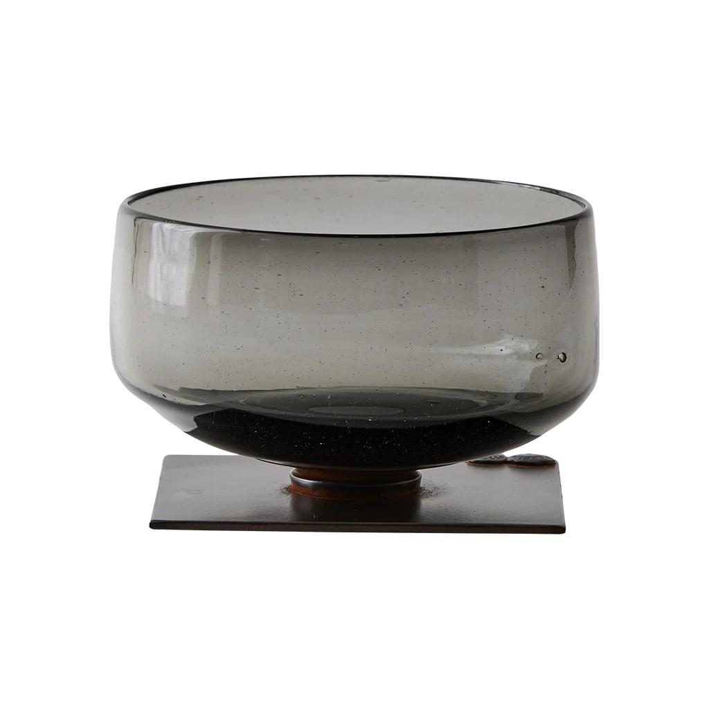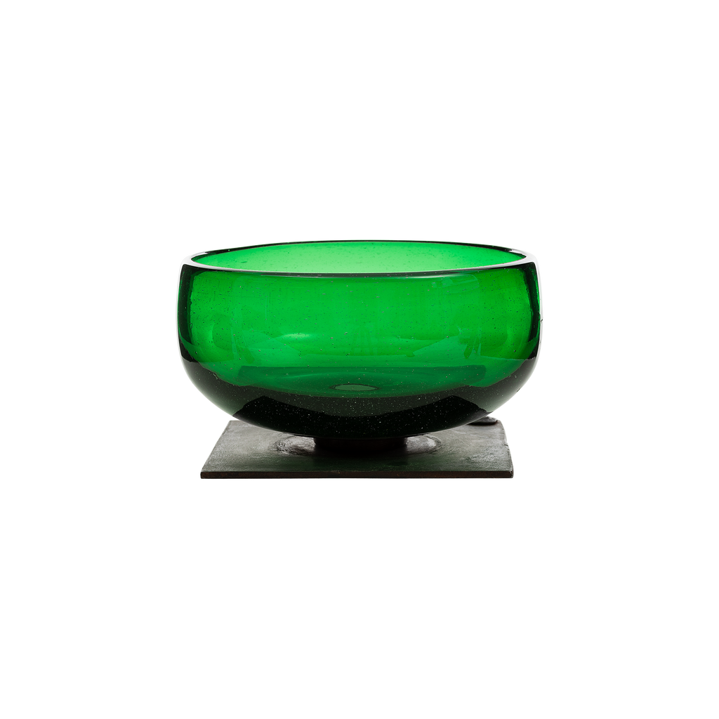 Vibrant verde mouth blown bowl perched atop of an iron stand.