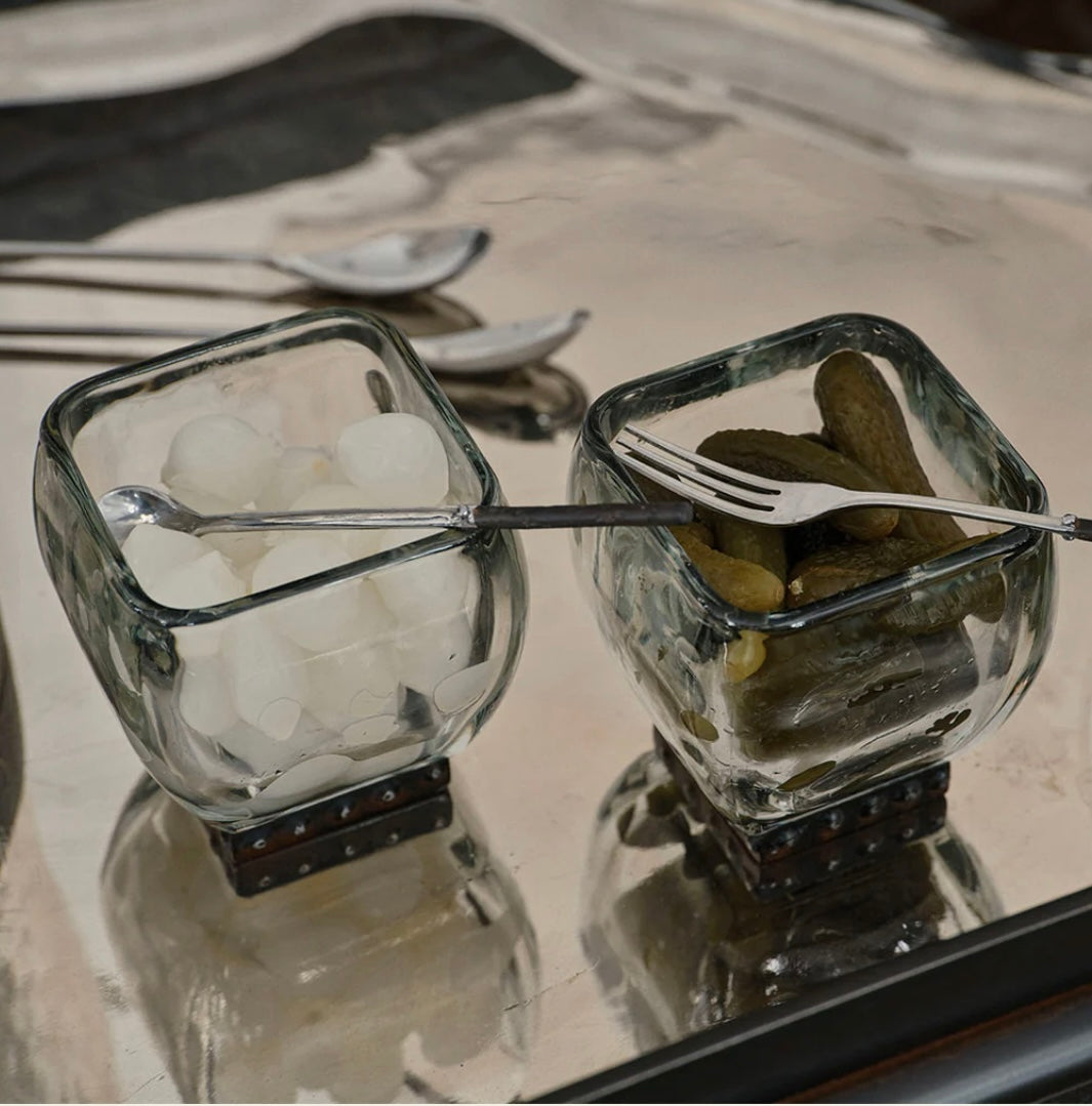 Crystal Glass w/ Beaded Iron Stand. Works well with our iron servers.