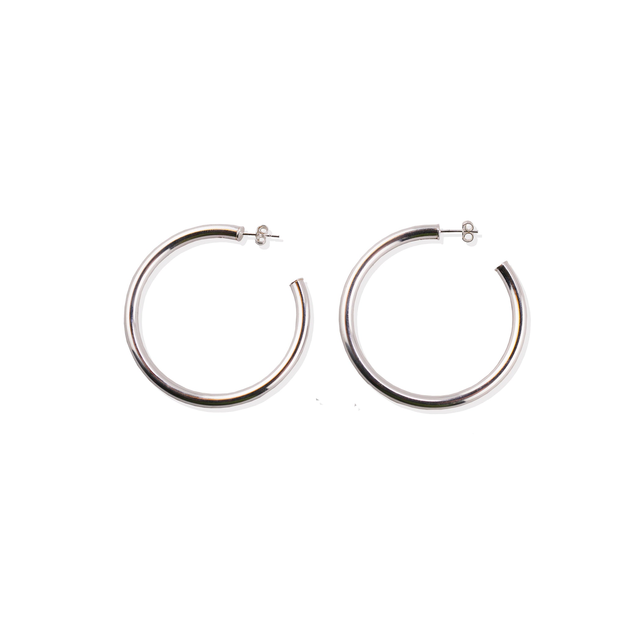 From our Capsule by CC + Co. Collection of jewelry wardrobe essentials at a sweet price point. The Details Sleek 925 sterling silver hoops Pure minimalism Hollow fully soldered Anti-tarnish Sterling posts 1 1/4"