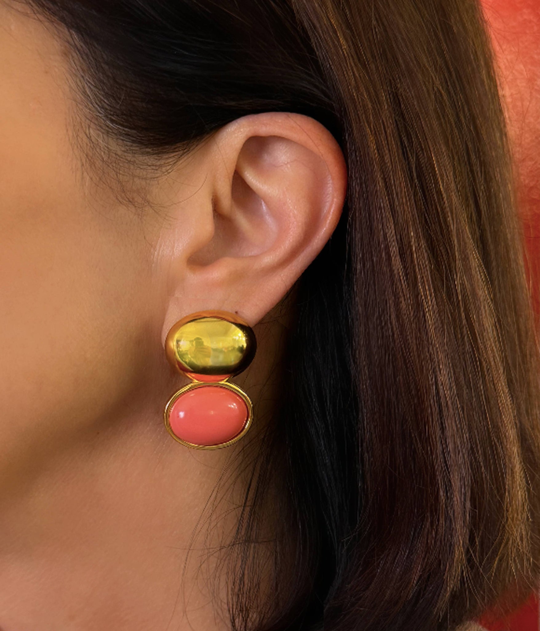 Named for the goddess of fertility The Details: Sculpted egg shaped polished 14 karat gold over brass 18 x 12mm oval cabochon Surgical steel post with large silicone hypoallergenic backs 1 ¼” length
