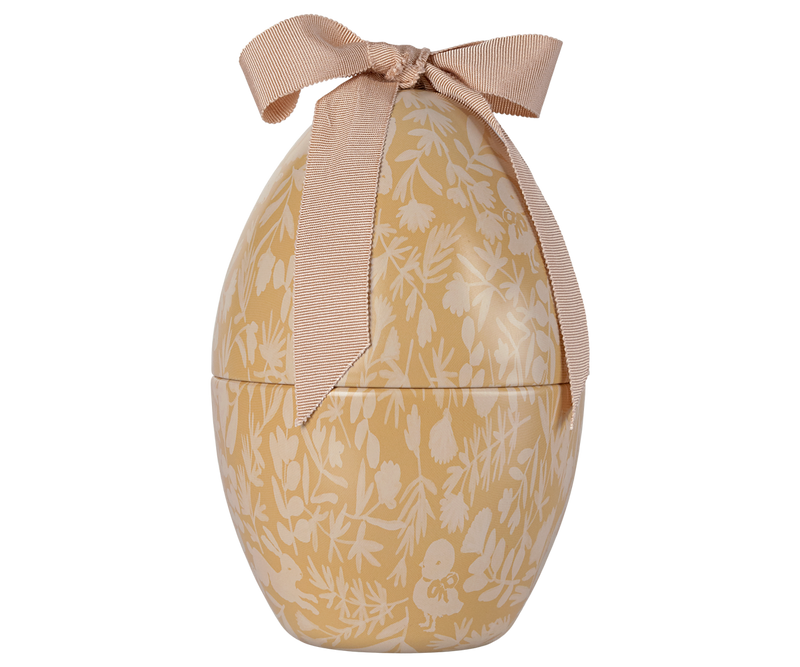 he Maileg easter egg has a beautiful new all over print. Take a good look at the print and see if you can find the different animals. The egg comes with a big soft bow on the top that gives the egg an exclusive look.