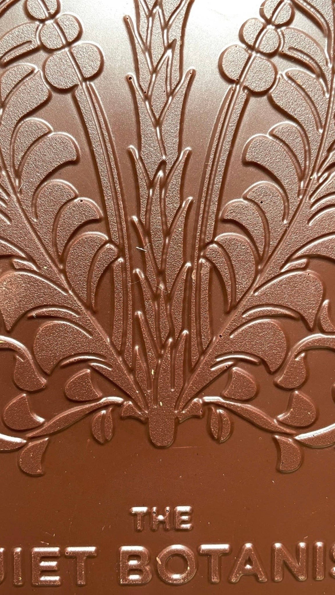 Nature Lover a delicious milk chocolate bar featuring Hazelnut Praline, Dates & Bee Pollen. With only 2% sugar a smooth delicious treat that is a customer favorite. One side features a beautiful botanical pattern while the reverse side is scattered with hazelnuts and bee pollen. Small batch, ethically sourced, fair trade and handmade. Wrapped in vintage botanical print paper, this large bar reveals an elegant moody gold sleeve which complements its botanically stamped chocolate Made in United States