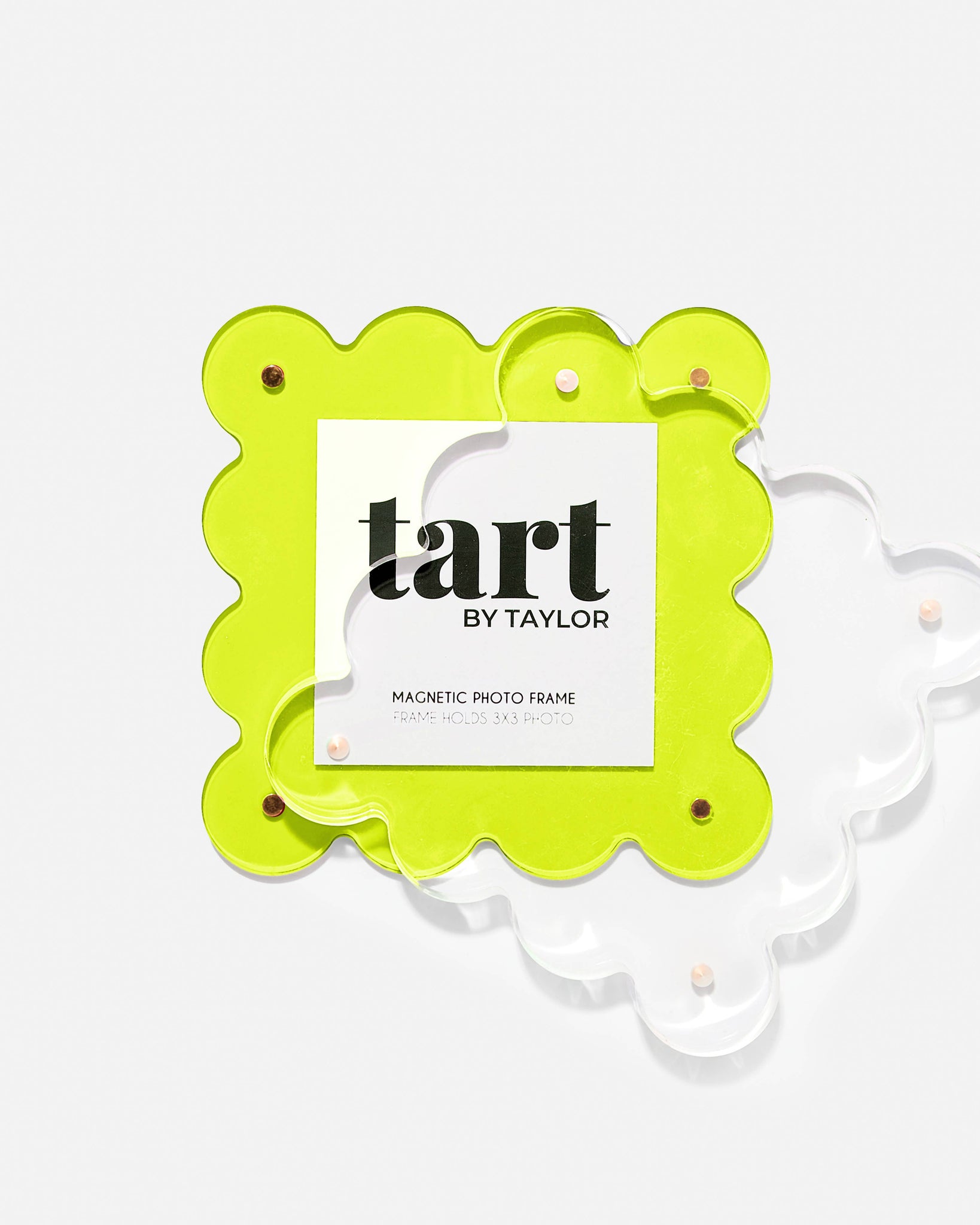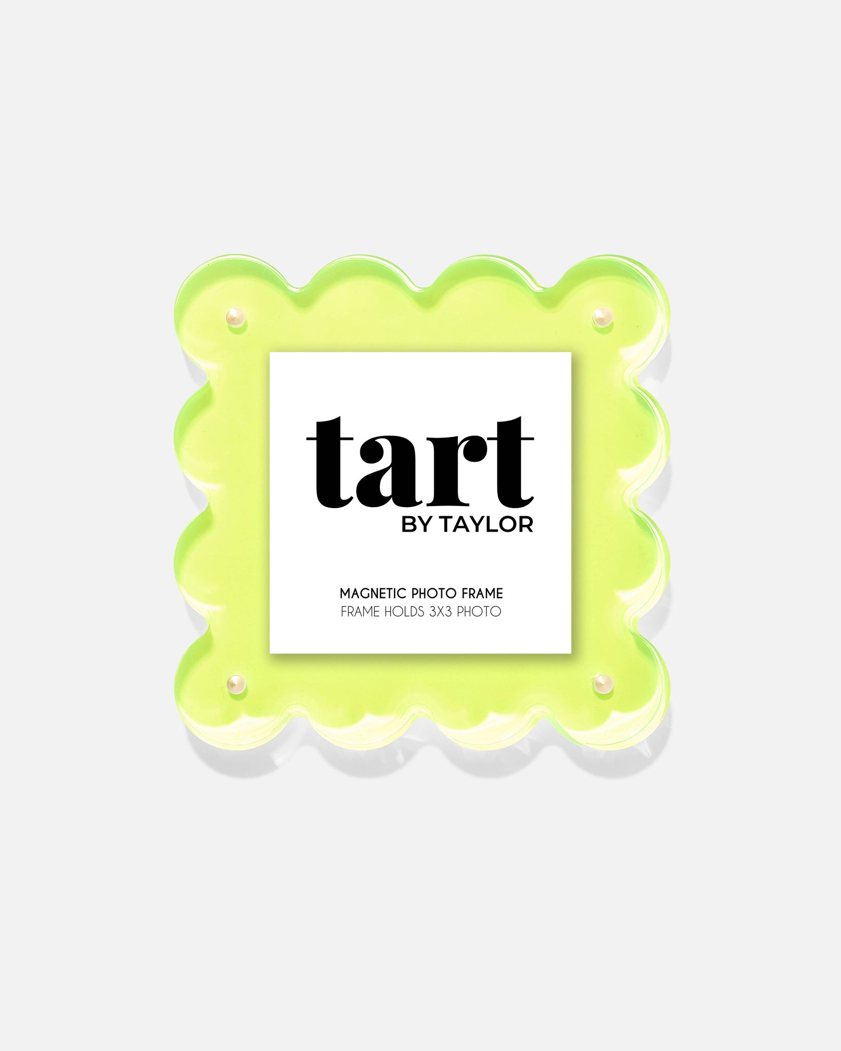 Show off your memories in a unique way with our Neon Lime Mini Acrylic Picture Frame! This acrylic scalloped frame adds a playful touch to your photos, making them stand out in any room. Great for nightstands, and desks plus they make for the perfect gift! -Frame Size: 5'' L x 5'' W x 1'' D -Frame holds up to a 4'' x 4'' photo - we suggest a 3'' x 3'' photo -Self-standing photo frame, can stand vertically or horizontally -Two acrylic panels simply attach together using four industrial strength magnets -Made of acrylic -Use a soft damp cloth to clean and keep inside