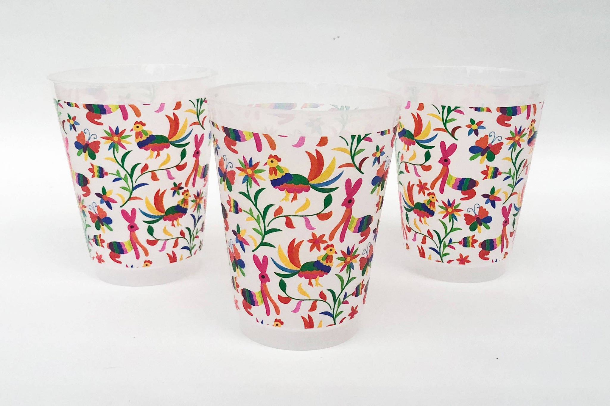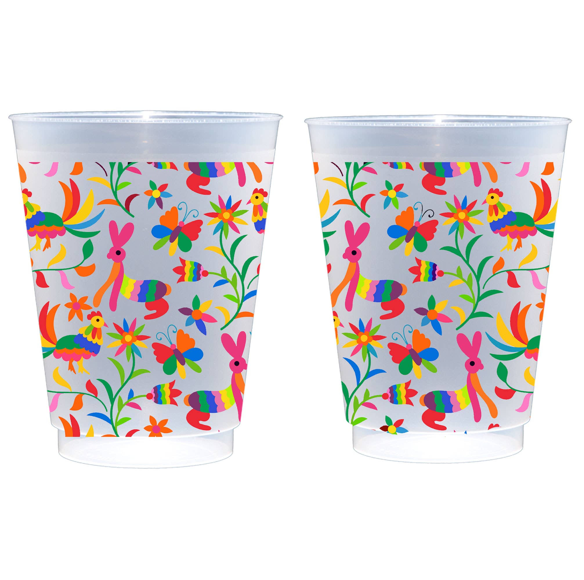 Our pre-printed Mexican embroidery/Otomi roadie cups are 16 ounces shatterproof. Sold in sets of 10, these are a perfect and affordable addition to your Taco Party or another Mexican food gathering. Cup Size: 16 oz frosted shatterproof cup Packaging